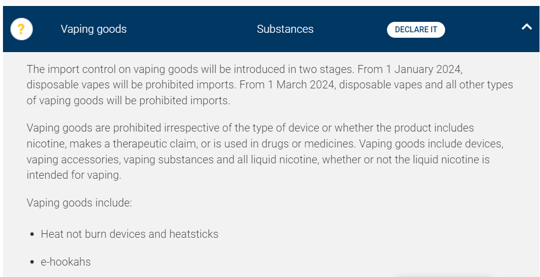 • 수입 허가 및 허가 없는 모든 베이프(충전식 포함) 수입 금지