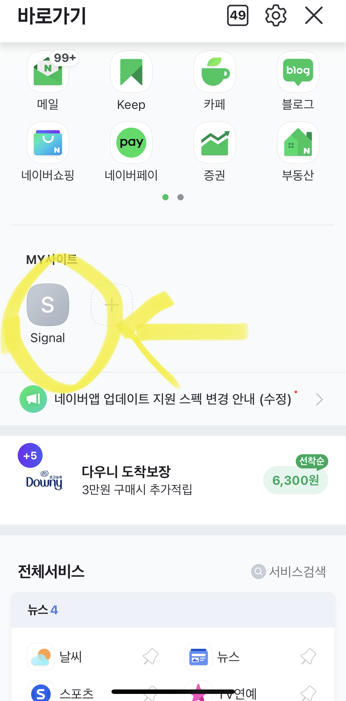 2. 화면을 아래로 내리면 네이버 메인에 #Signal 추가 라는 상자가 나옵니다.