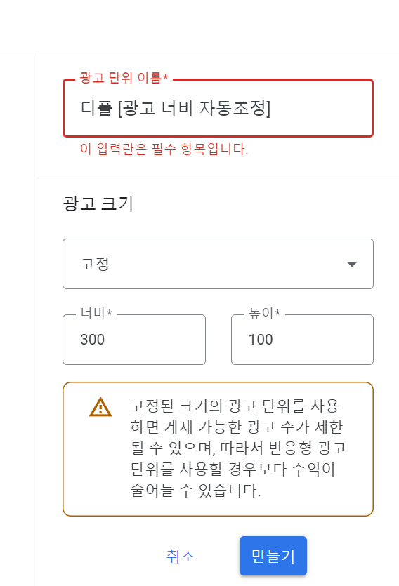 디스플레이 광고 - 고정형 으로 들어간후 광고 단위 이름을 먼저 정해 주세요.