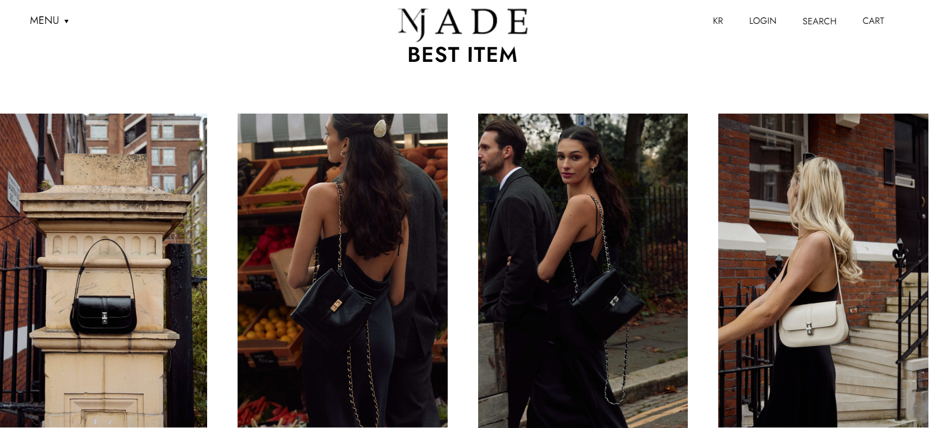 엠제이드는 1990년대 런던의 클래식을 모토로 디자인을 선보였는데요, 웹사이트에도 로맨틱, 클래식, 세련된 이미지가 어우러져 딱 20-30대 여성의 취향을 저격했습니다. 합리적인 고급스러움을 포커스로 가져가는데요.