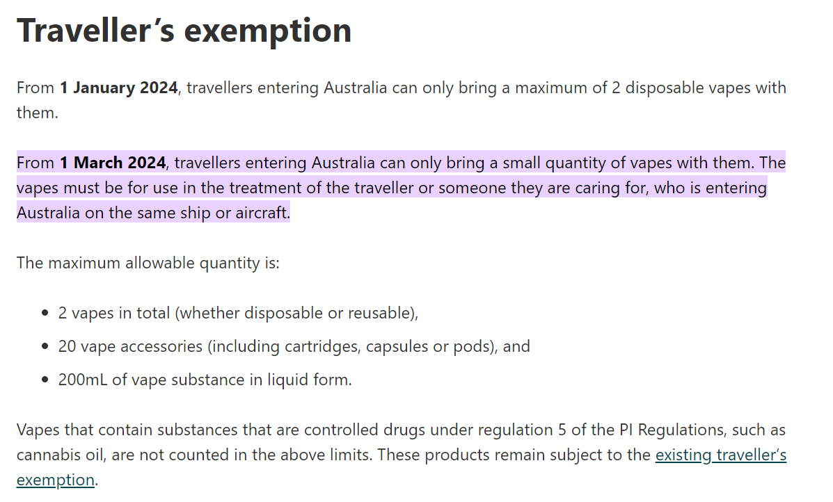 일회용 대마초 베이프를 반입하는 경우 베이핑 제품에 대한 여행자 면제가 적용되지 않습니다. 일회용 대마초 베이프는 의약품 및 물질에 대한 여행자 면제 요건을 충족해야 합니다. 치료 .